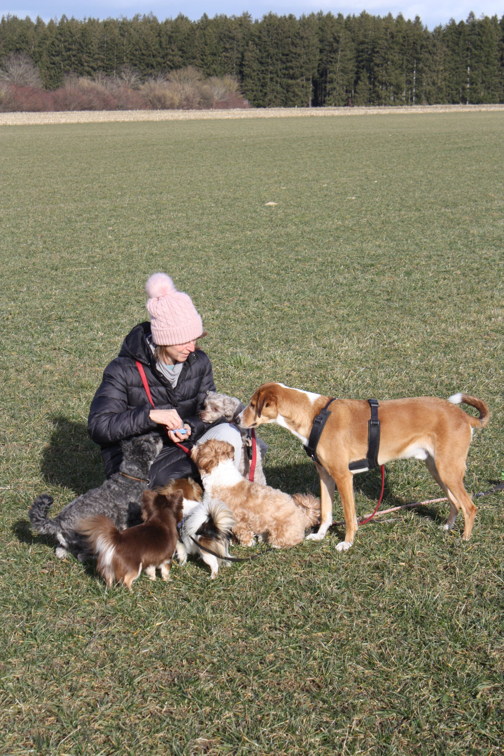 Diese Frage höre ich von Nachbarn, neuen Kunden, Freunden und Verwandten immer wieder. Und immer sind alle sehr erstaunt, dass ich dies bejahe. Wir gestalten sowohl das Kennenlernen als auch den Alltag sehr achtsam. Schnell merken wir, wenn es kleine Spannungen gibt und dann wird ausgeglichen. Die Hunde müssen sich nicht lieben. Aber wir sorgen dafür, dass alle respektvoll miteinander umgehen. Das funktioniert in der Regel hervorragend. Bekannte Aggressionen wie beim Futterneid sind kein Problem – denn auch das Füttern läuft geregelt ab und wird als Lernfeld genutzt.